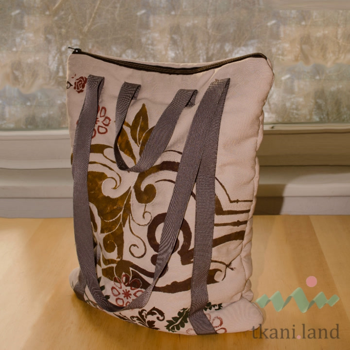 Также саму сумку можно сделать очень вместительной по размеру. Другое дело – сумка в руке. Делайте ручки покороче, прикиньте размер, чтобы сумка не волочилась по земле. В нашем случае размер сумки в готовом виде 52х41 см и предназначена она для ношения на плече. Ручки из стропы шириной 3 см, длиной 68 см в готовом виде.