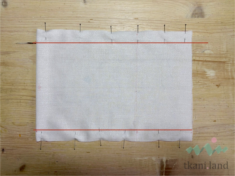 Заметанный срез укладываем ко второй линии, чуть заходя за нее, на 1-2 мм, фиксируем булавками. Приметываем.