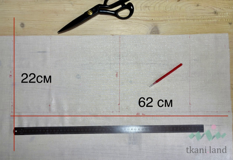 Перед раскроем создадим бумажную выкройку. Для экономии времени этот пункт можно пропустить. Выполняем предварительные расчеты, после размечаем детали прямо на полотне. Моя оригинальная упаковка для подарков своими руками в готовом виде должна быть длиной 20 см. Я отмерю сразу две длины, поэтому по дну получится избежать шва – там будет проходить сгиб. Закладываем дополнительный припуск на обработку среза, будущую кулиску, по 11 см с каждой длиной стороны. Для этого я добавлю еще 22 см. В результате отмеряем длину в 62 см. По ширине мое изделие будет 20 см. Добавляем по одному сантиметру по краям на обработку припусков, отмеряем ширину 22 см. Вырезаем деталь.