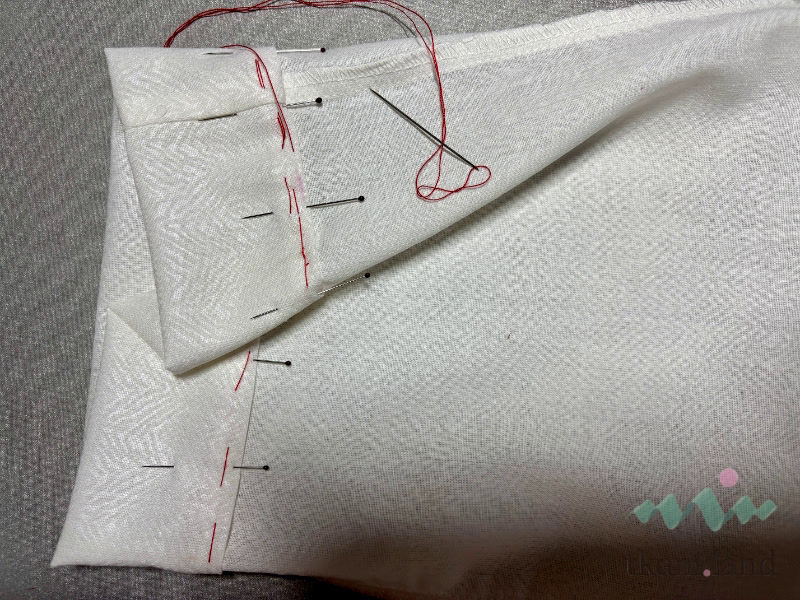 К линии, которая ближе к краю, укладываем срез, приутюживаем, после этого фиксируем наметочной строчкой.