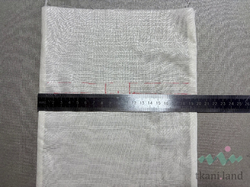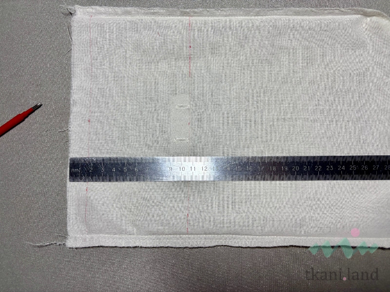 Теперь необходимо разметить место будущих отверстий под завязки. Выворачиваем работу на лицевую сторону, укладываем на стол, расправляем. Отмеряем от низа 20 см, проводим линию – это высота в готовом виде. От нее отступаем 10 мм, намечаем еще одну линию. Между ними будет располагаться наша утяжка. По линейке находим середину этих линий, отмечаем эти точки. От них отмеряем в стороны 15 мм, ставим метки – тут будут располагаться наши отверстия для утяжки.