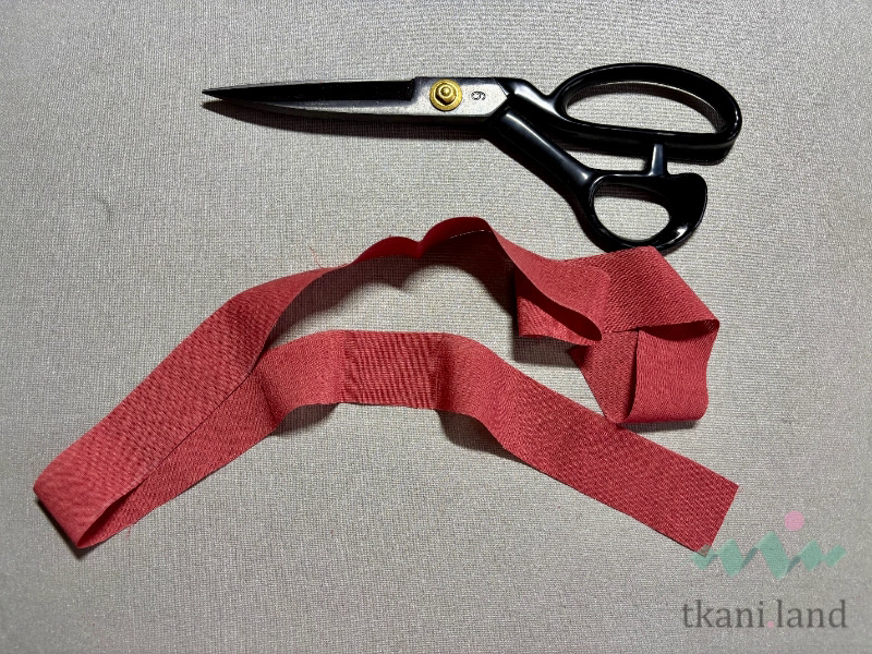 В качестве завязок можно использовать атласную ленту, джутовый шпагат или сделать своими руками из полотна в тон. Для этого на лоскуте по долевой размечаем, а после вырезаем прямоугольник длиной 80-90 см, шириной 3 см.