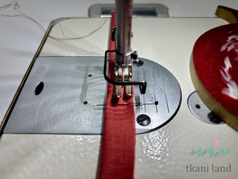 Складываем по длинному срезу лицом внутрь, скалываем. Стачиваем на расстоянии 5 мм от края.