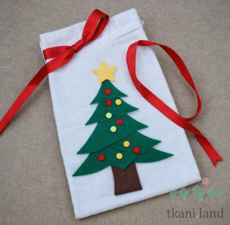 На полотне красного цвета хорошо будет смотреться аппликация из фетра в виде нарядной елочки или веселого снеговика. Ее можно настрочить на машинке, закрепить ручными стежками, приклеить термо-пистолетом.