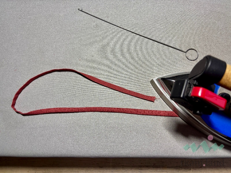 Специальным крючком или используя длинный конец нити, оставшейся от стачивания, выворачиваем на лицо. Утюжим, охлаждаем деревянным утюжком.