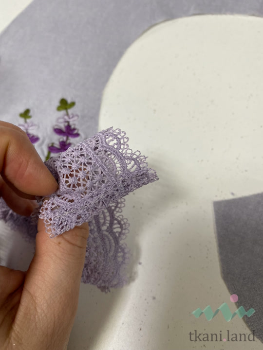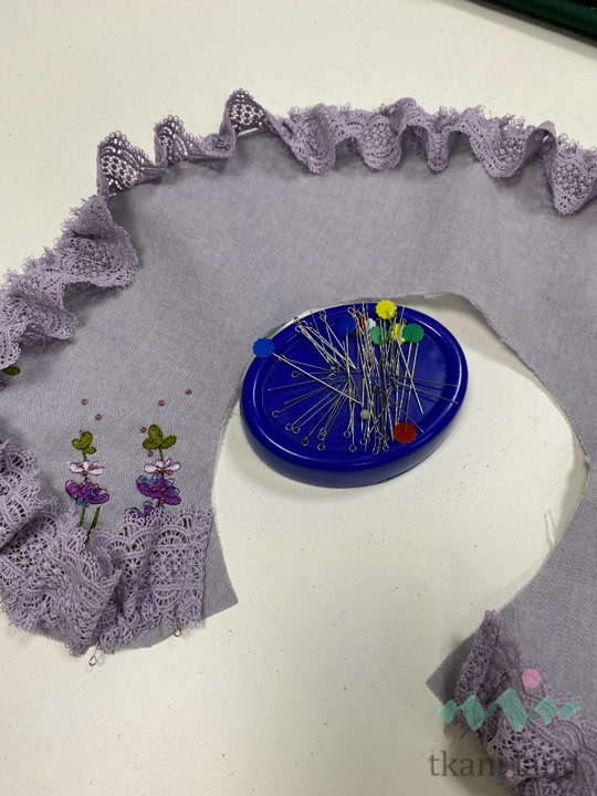 - Разложим кружево по внешнему срезу воротника. Лишнюю длину можно срезать.