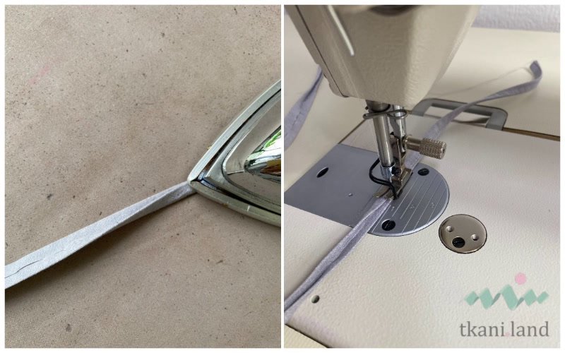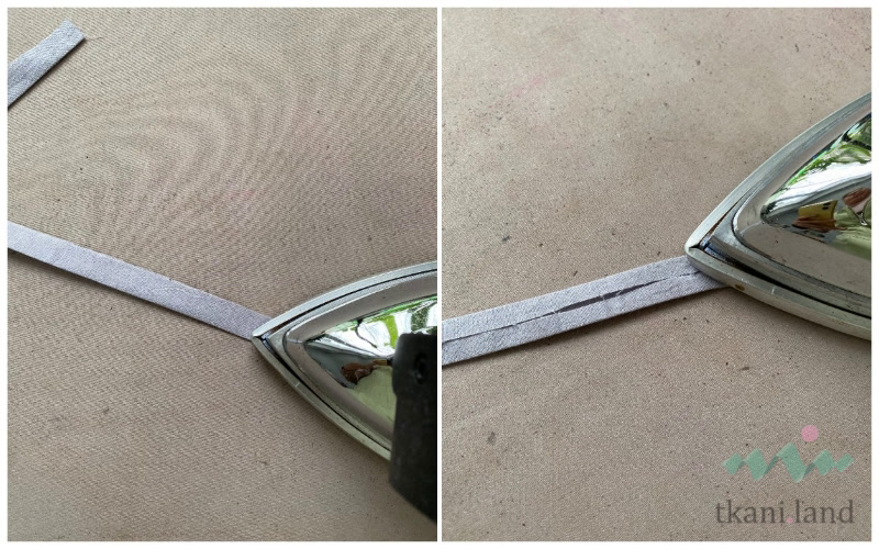 - Заготавливаем завязки: заутюживаем сначала детали пополам по длинным сторонам. Затем заутюживаем припуски к середине изнаночной стороны.