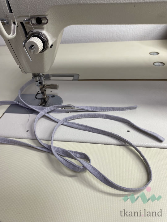 - Потом заутюживаем заготовку вдоль пополам. У нас получается длинная веревочка шириной примерно 0,7 см.