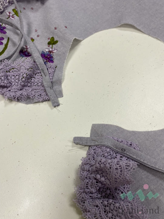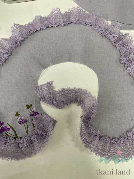- Затем отступаем от среза 1 см и начинаем скалывать кружево с деталью верхнего воротника лицом к лицу, равномерно распределяя сборку. На закруглениях можно стянуть чуть сильнее, на спинке чуть меньше.