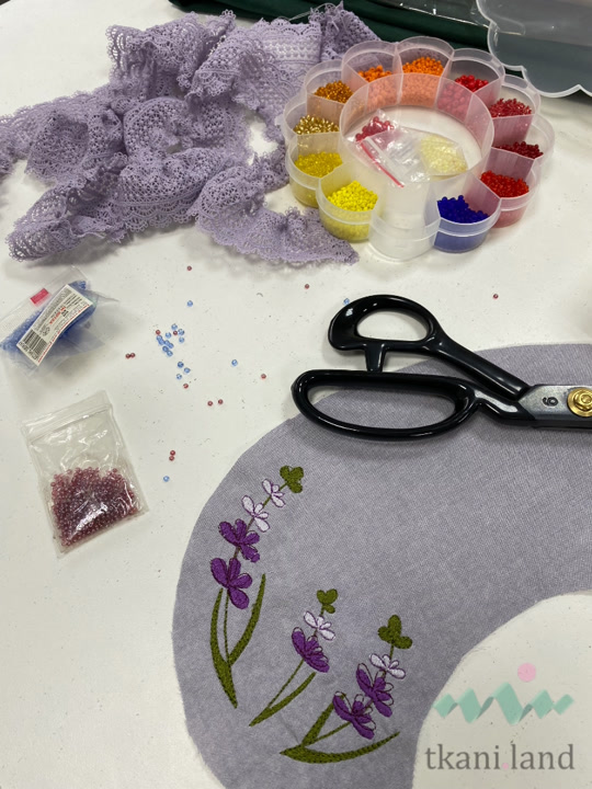 - Мы будем делать машинную вышивку и оформлять её вручную стеклянным бисером двух цветов с помощью специальной тонкой иглы.