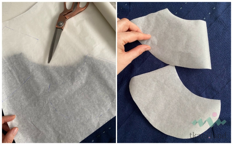 - Выкраиваем две детали воротника из ткани, одну деталь из дублерина.