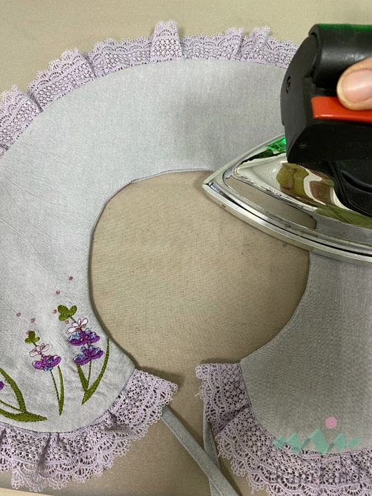 - Скалываем нижний и верхний воротник лицом к лицу. Завязки и кружево остаются в середине между слоями.