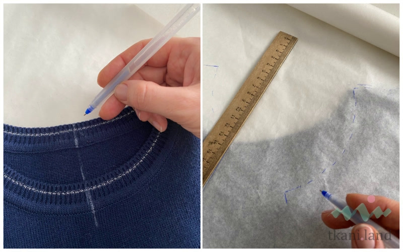 - Затем накладываем кальку на переднюю часть изделия и очерчиваем переднюю часть горловины с середины до плеча таким же образом.