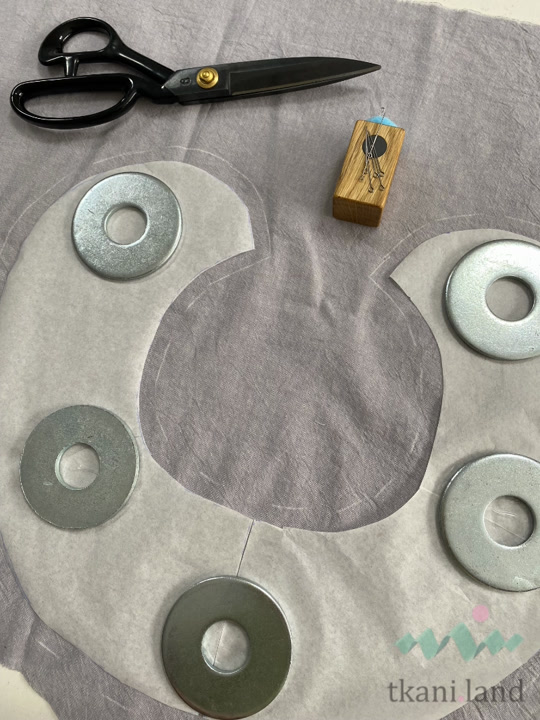 - Раскладываем нашу выкройку на ткани, обводим мелком, добавляя припуски 1 см.