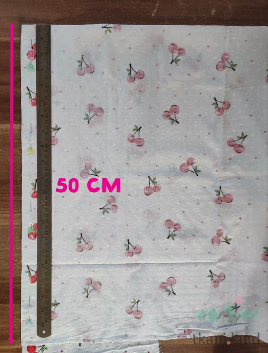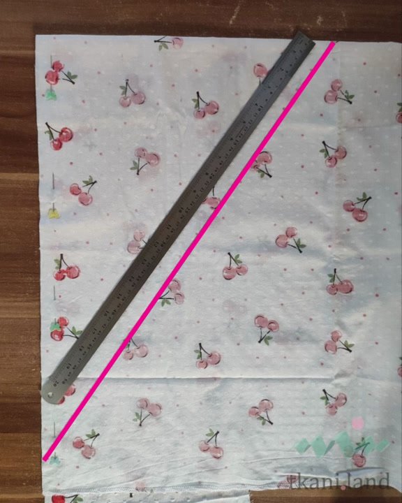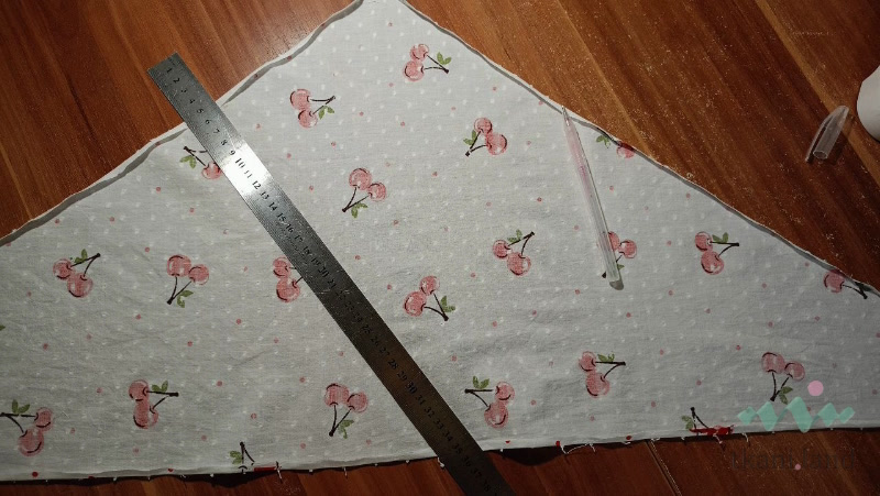 С помощью длинной линейки, терморучки или мыла наметьте ширину. Если вы хотите косынку с длинной стороной 100 см, отложите половину этого расстояния от сгиба вниз по срезу.