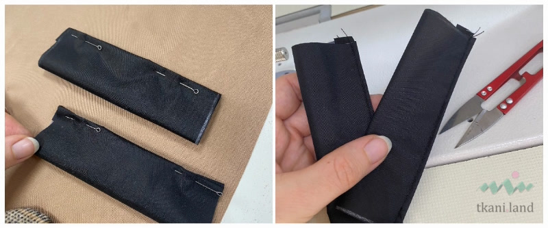 Заготавливаем паты. На маленьких прямоугольниках (12 на 10 см), загибаем припуски по длинной стороне на 1 см, а затем складываем деталь пополам изнанкой внутрь. Прокладываем строчку.