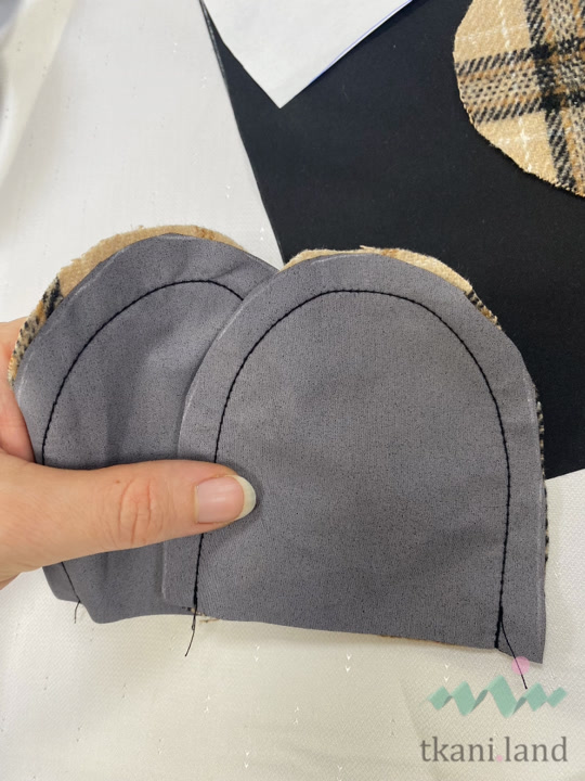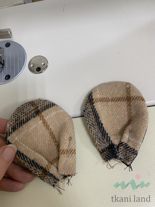 Элементы ушей складываем лицом и внутрь и стачиваем прямым стежком по закругленной стороне, припуск 1 см.