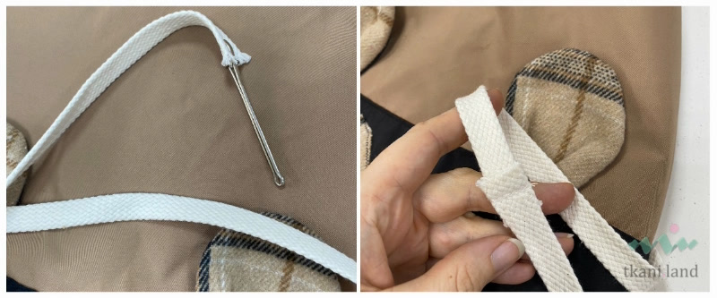 Для завязок понадобится два отрезка шнура по 1,5 метра. Сначала продеваем один шнур с одного бока через пату и обе верхние части, кончики связываем или застрачиваем друг с другом. Затем вдеваем второй шнур с другого бока так, чтобы они шли навстречу друг другу.