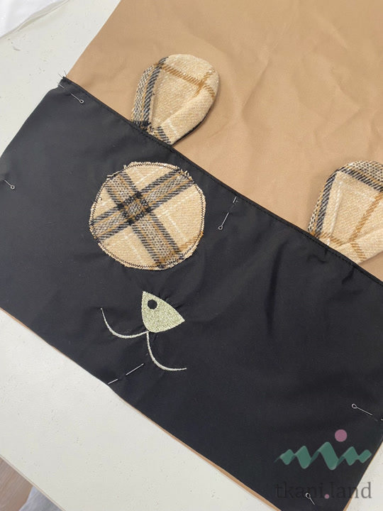 Отступаем с боков по 10 см и скалываем ушки с основой лицом к лицу. Стачиваем прямой строчкой с припуском 1 см.