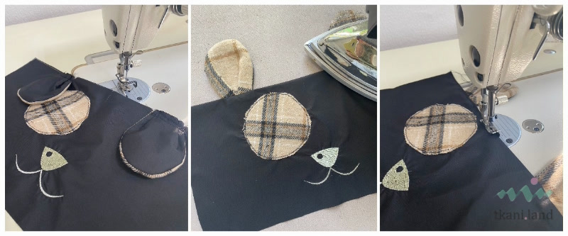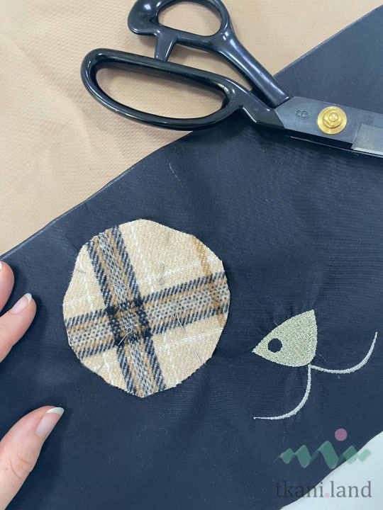 Прикалываем булавками кружок на месте, где будет глаз, и пришиваем его строчкой зигзаг.