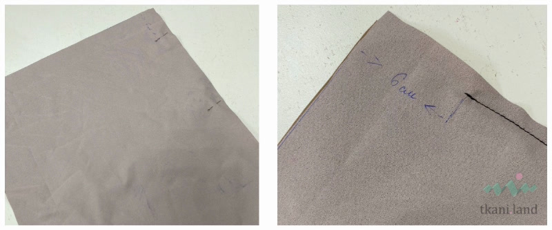 Складываем подкладку с основой лицом к лицу и прошиваем верхнюю часть от надсечки до надсечки (сверху и по бокам в 6 см). На коротких сторонах в 6 см оставляем незашитыми фрагменты по 3 см для прохождения шнура.