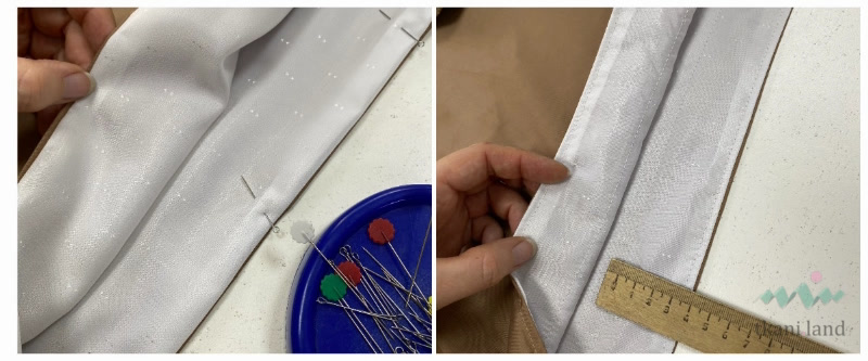 Фиксируем булавками верх с подкладкой, создавая небольшой перекант на сторону подкладки.