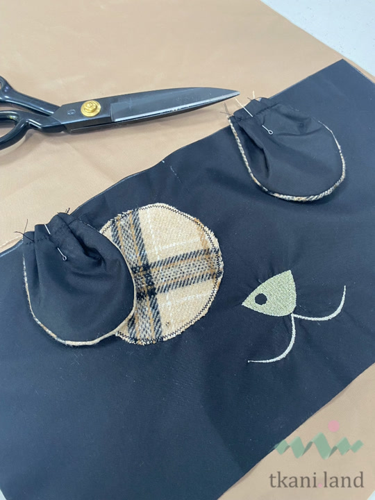 Срезаем припуски до 3 мм на верхнем круглом участке, выворачиваем. Слегка приутюживаем. Складываем защипы на нижнем необработанном срезе для придания объемной формы, закрепляем на швейной машине.