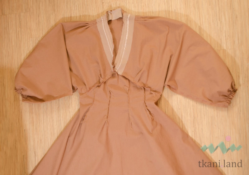 Далее необходимо обработать горловину платья подкройной обтачкой.