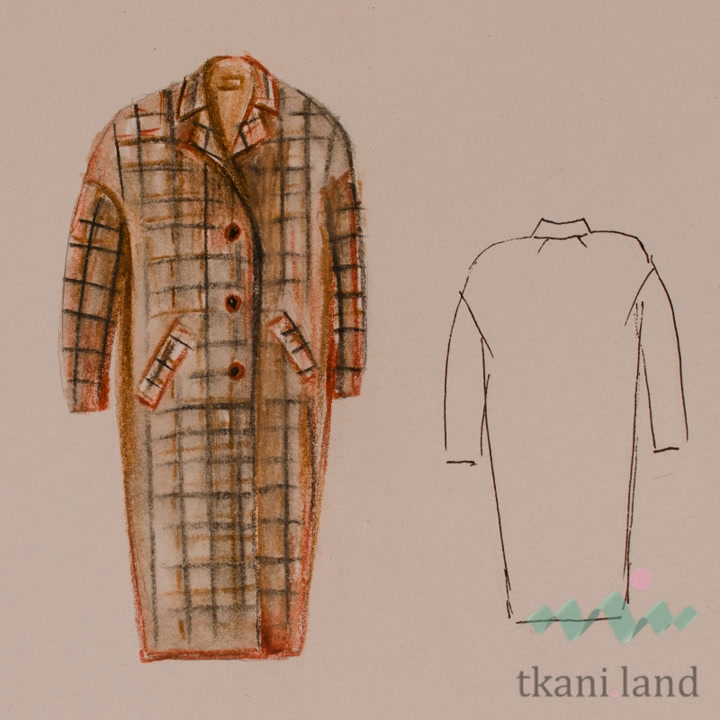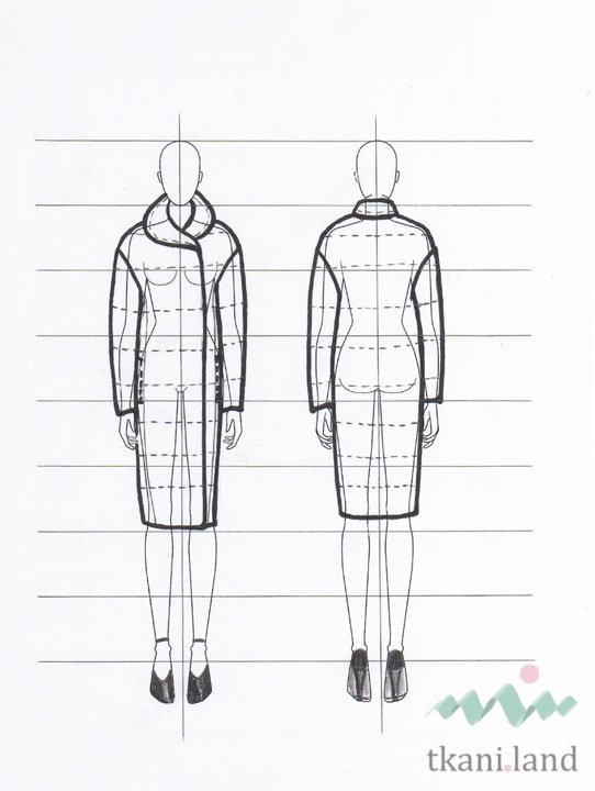 Важен подбор соответствующей базовой основы и правильно проведенное техническое моделирование. Рассмотрим вариант пальто с однобортной английской застежкой на три прорезных петли и пуговицы. Ниже приведен художественный эскиз из ткани в клетку.