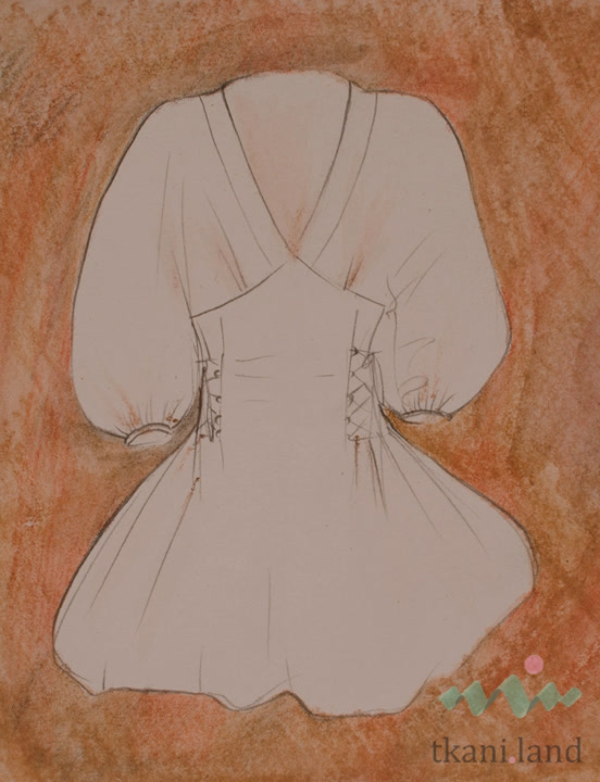 Начинается работа с выбора соответствующей базовой основы. В данном случае это конструкция с цельнокроеным рукавом, вытачками на талии, в которые будут спроектированы корсетные петли (на переде). Перед состоит из двух деталей, спинка цельнокроенная. В боковые швы вшит пояс для придания приталенного силуэта.