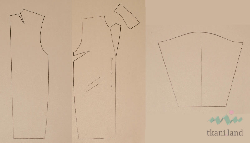 По эскизу видно, что плечевые вытачки спинки переведены в горловину, нагрудные вытачки частично закрыты и переведены в боковой срез. Пальто немного расширено в области груди, плечевой срез удлинен на 5 см., глубина проймы опущена на 8-9 см. Важно правильно рассчитать высоту оката рукава и сопоставить длину проймы и длину оката рукава. Посадки по окату рукава не предполагается, она может быть даже отрицательной. Это характерно для рубашечного покроя рукава, который мы рассматриваем.