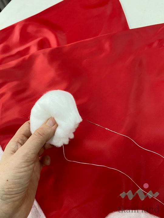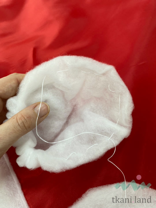 Делаем помпон: Наполняем деталь пухом или обрезками утеплителя, стягиваем ниткой по периметру, чтобы получился шарик.