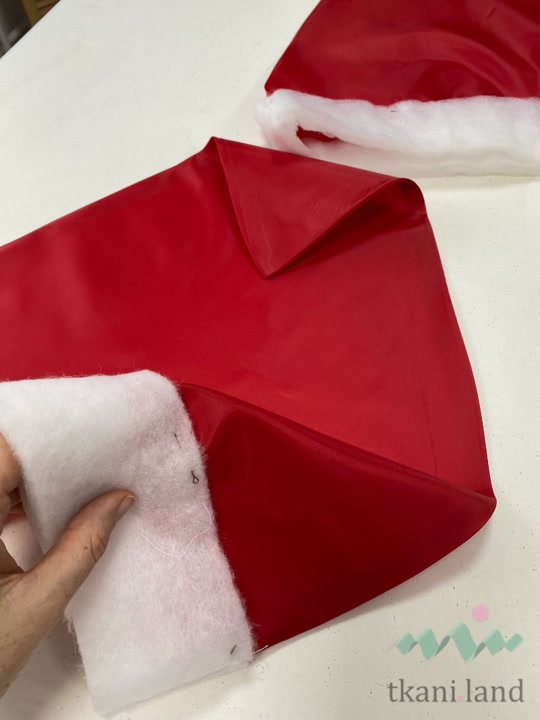 Стачиваем по боковым сторонам наши шапочки. Высекаем уголки. Выворачиваем на лицевую сторону, утюжим.