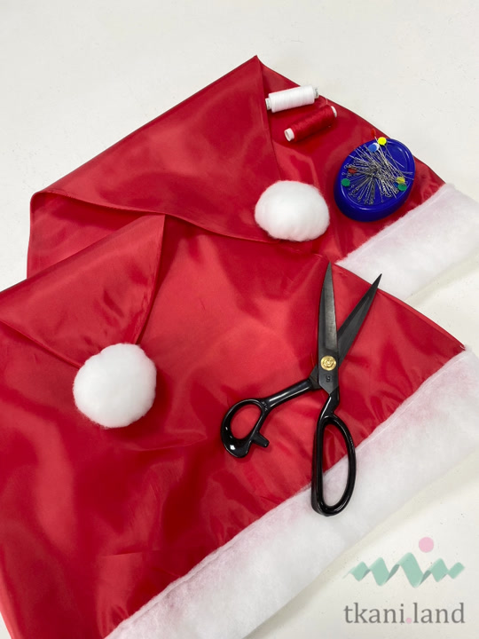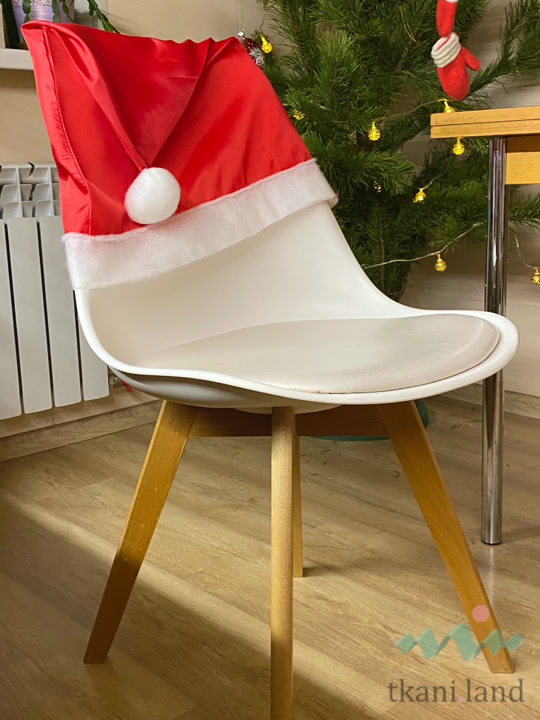 Мы будем изготавливать шапочки на спинки стульев в виде новогодних колпаков. Нам понадобится отрез ткани красного или бордового цвета (примерно метр на полтора), красные и белые нитки в тон, небольшой отрез белого утеплителя или фетра для декора шапочки и швейная машинка.