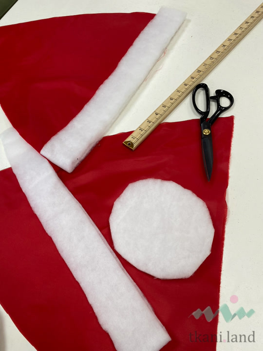 Для каждого стула выкраиваем по две детали из красного материала, по одной полоске для опушки низа (102 см длина с припусками, ширина 7 см) из утеплителя, по одной детали для помпона (круг диаметром 15 см).