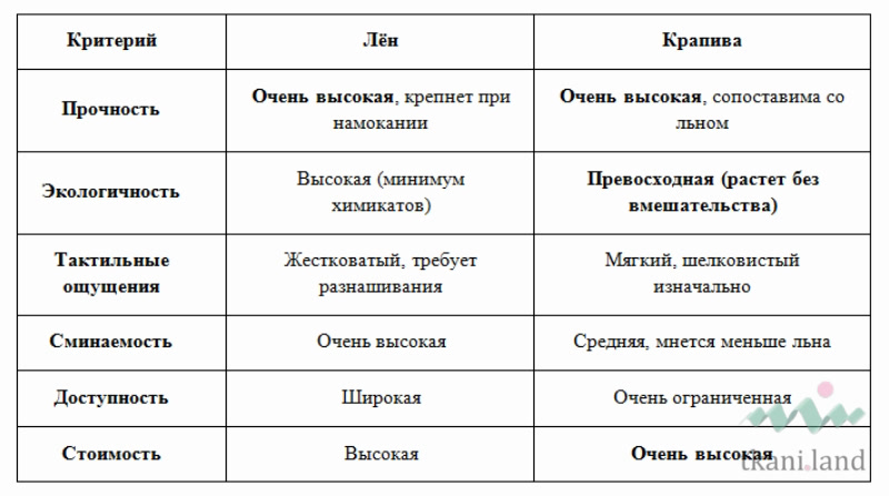 В интернет-магазине Tkani.land крапива имеется в природных, сочных, базовых: белом, черном цветах. Они имеют ширину 140 см, плотность 245 гр/м2. Наши покупатели шьют из нее домашние комплекты, сарафаны, брюки, рубашки. Отзывы вы можете посмотреть в нашей группе ВК.