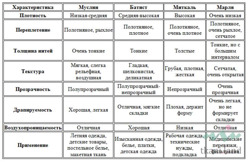Классификация муслина зависит от типа волокна, из которого материал изготовлен, плотности, обработки.