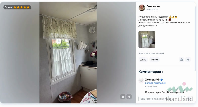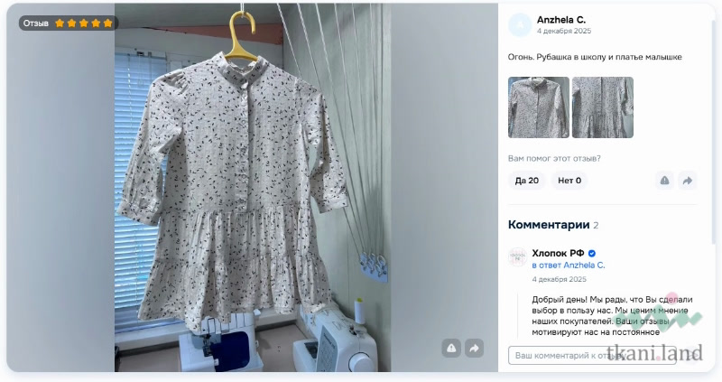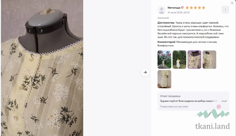 Наши клиенты делятся своими впечатлениями от ткани на страницах маркетплейсов. Многие отмечают мягкость материала, его дышащие свойства и эстетичность. Рубашки, летние платья - самые распространенные идеи для шитья.