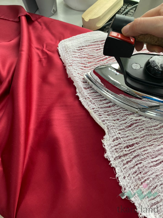 - Глажка: гладить его следует слегка влажным, с изнанки, при низкой температуре без пара, используя марлю, иначе получатся ласы.