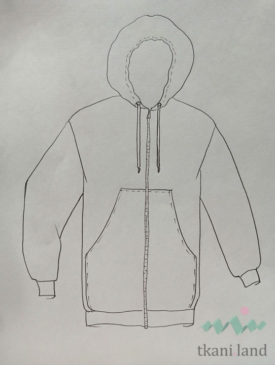 Рассмотрим особенности выкройки унисекс изделия – худи с капюшоном, карманом-кенгуру, манжетами на рукавах и по низу изделия.