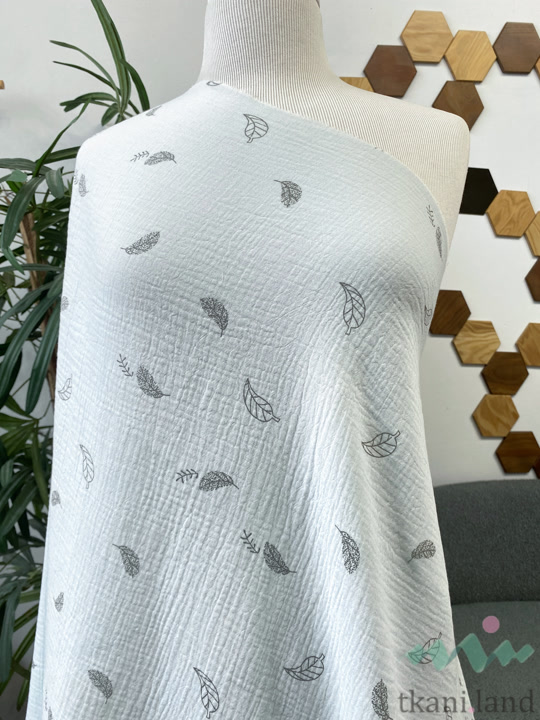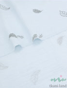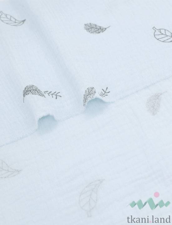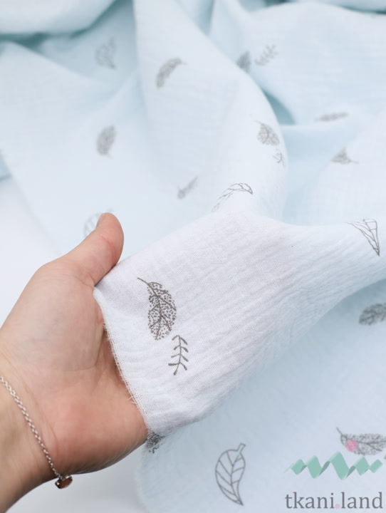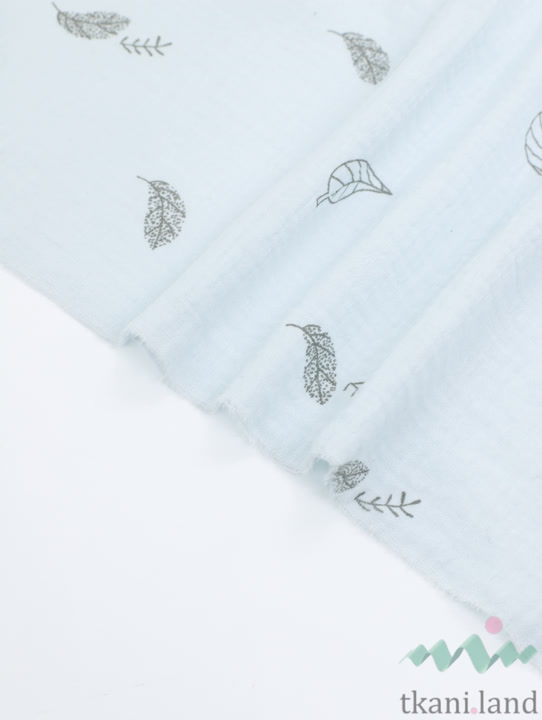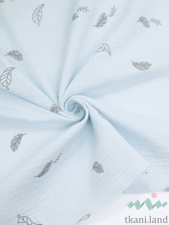 Муслин двухслойный «Маленькие перышки и листики на голубом»